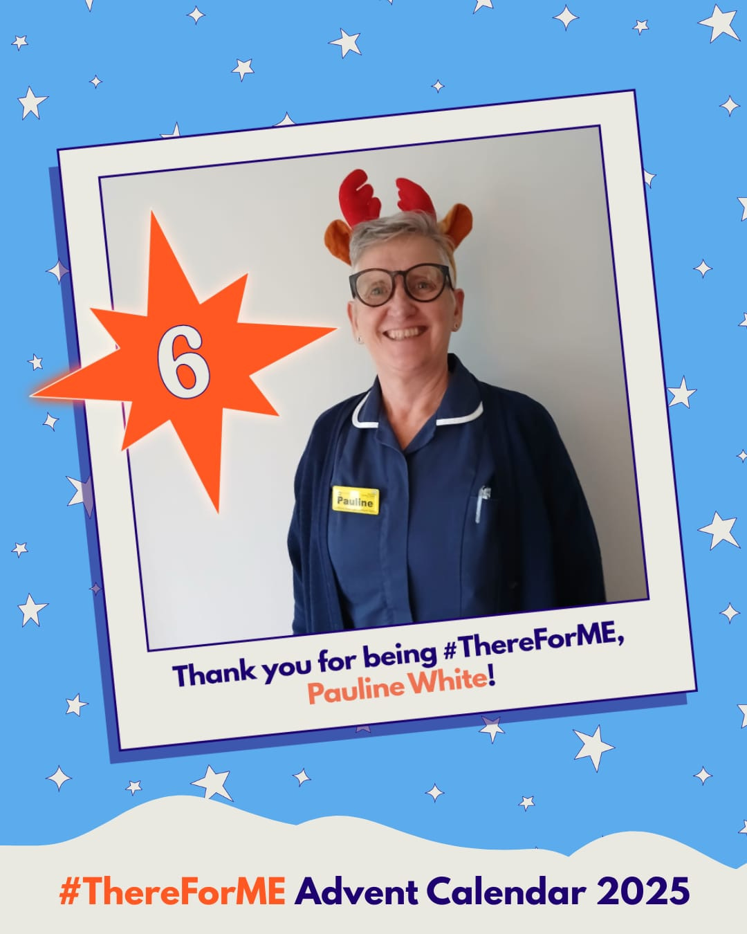 Behind door number six is Pauline White, our second healthcare worker of the advent calendar! We often talk about the need to improve NHS services for people with ME. So, it’s brilliant to take a moment to celebrate the NHS staff out there who are already getting it right.