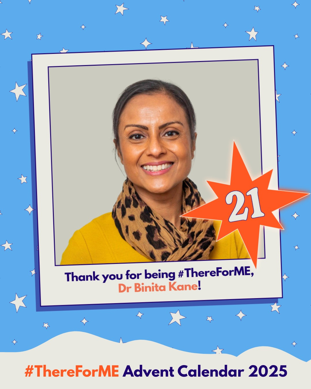 Behind door number 21 is Dr Binita Kane! Dr Kane is the founder and clinical lead of the Long Covid Clinic, and a consultant with a special interest in ME and Long Covid. She is also a long-standing friend of the campaign, as a #ThereForME Ambassador and fierce advocate for people with ME. Dr Kane was nominated by Alexis, who thanked her for her work: