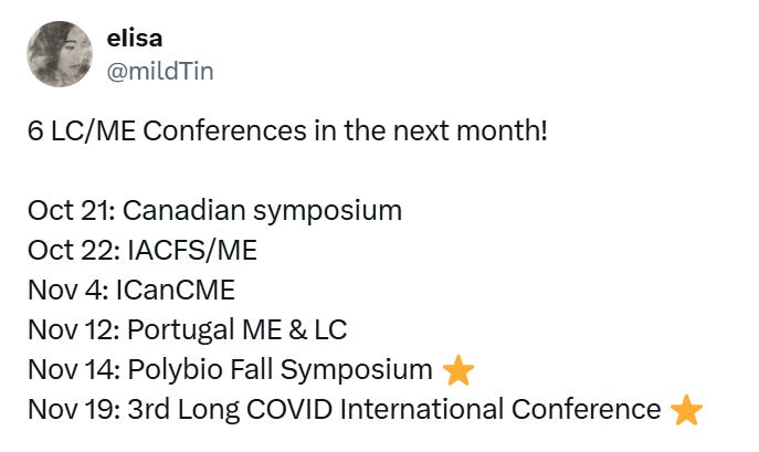 It’s a busy time internationally for conferences focused on ME and Long Covid. A shoutout to Elisa on Twitter/X who spotted six research conferences taking place in October and November alone - from Canada to Portugal!
